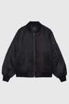 A traditional military-inspired bomber jacket made from a durable, slightly padded 100% polyester shell with a subtle sheen. Features traditional flight jacket details including a bright orange interior lining, two front flap pockets, a zipped sleeve pocket, and ribbed knit trim at the neck, cuffs, and waistband. Finished with a branded vegan-leather zipper pull down the center.