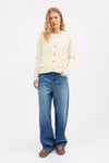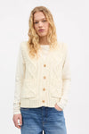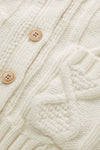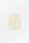 White Sun Vest mixes cables, pearl knit and Aran details to create a textured knitted vest knitted in 100% merino wool. It has a V neck, two patch pockets and is fastened by four buttons down the front. Chunky rib finishes the armholes and hem.