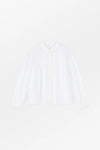 Lulu Shirt is a 100% organic cotton shirt with multiple fine pleats and pintucks running down the front. A hidden button placket is trimmed with delicate ruffled lace as is the collar. The voluminous sleeves are set with a shoulder seam slightly moved to the front and are finished with gathered cuffs, also edged with lace.