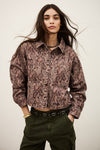 The super cool printed denim Tullia jacket from ba&sh will give your wardrobe an instant update. In a plum hue with an all-over paisley print, it is slightly cropped and featured press stud fastenings down the front. Finished off with two patch pockets on the front one with a subtle ba&sh logo in yellow thread.