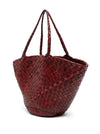 The "Egola" reinterprets traditional basket weaving techniques into a modern accessory, featuring a striking pattern of irregularly woven tapered leather strips. This woven leather bag boasts an open top design, making it versatile and suitable for all seasons. Its unique weave not only showcases craftsmanship but also adds texture and depth, enhancing its visual appeal.