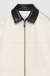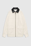 Cut from a smooth, structured fabrication, it features a sharp point collar in contrasting black, a full front zip closure, and oversized patch pockets for a utilitarian edge. The relaxed silhouette and dropped shoulders on the Holden Jacket lend effortless volume, while subtle tailoring keeps the shape refined. A versatile layer designed to balance polish with ease.