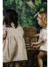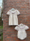 Molly dress features a vintage classic look that has a sweet beige and lavender colour combination. It has a smocking bodice, button fastenings at the back, short puffy sleeves and layered ruffles around the collar. Wear it with a pair of sandals and our Daisie sunglasses! Match your Molly Dress with our Molly Romper!
