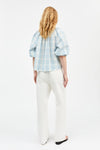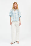 Feminine blouse with three-quarter sleeves and ruffle details.