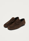 The Aven brown suede loafers are crafted with a classic penny strap and a distinctive moccasin-style upper. The rich brown leather provides a refined look, while the gathered detailing adds a unique touch.