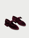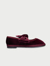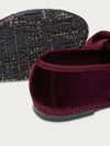 - Velvet slipper in dark red with dark red piping and a bow as closure.