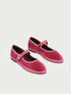 - Velvet mary jane in pink with pink piping and buckle closure.