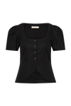 A signature FAITHFULL silhouette, reimagined with new elevated details and designed from a 100% European Flax® linen fabrication. It is a vest-style top with a scoop neckline in a black colourwy. It has matching buttons down the font and oversized cap sleeves with subtle gathering at the top. It is a relaxed fit with a curved hem and is fully lined so will hold shape. There is a back waist belt with tie detailing, allowing for additional cinching at the waist. Style with the jean pant for elevated everyday wear.