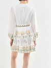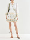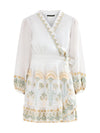 Romantic white cotton mini dress with delicate floral embroidery in gold, sage blue, and peachy pink. The wrap-style bodice features an adjustable tie closure for a customisable fit, while puff shoulders and gathered cuffs with embroidered trim. Perfect for effortless, feminine style.