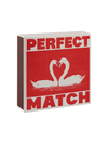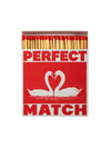 Our signature square matchbox featuring two swans making a heart with their heads and the words 'Perfect Match' in bold red type. Striking in every sense – these matchboxes are filled with 125 matchsticks ready to spark a little joy. Designed to add character to coffee tables, mantelpieces, and gift drawers, each box is a blend of function and flair.