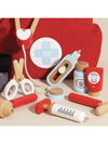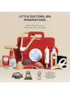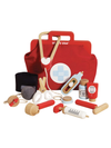 Comprising a vintage style fabric bag, crafted from a stunning red fabric with carry handles and a sturdy wooden base. Complete with 9 colourful wooden play accessories and unique features to discover, including a stethoscope, thermometer, ointment and more. Role play has never been so much fun!